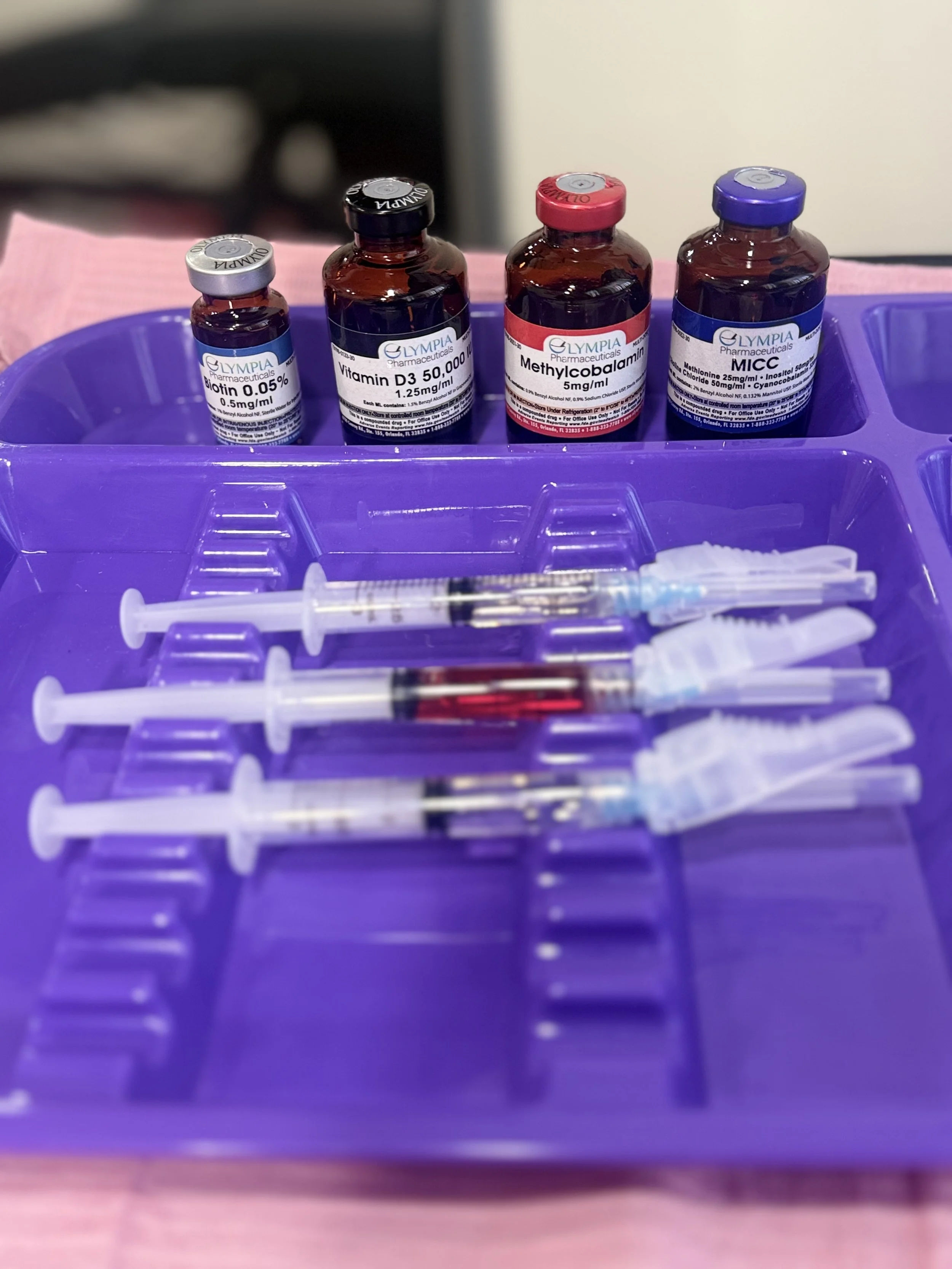 Vitamin B12 injections can help with energy levels, brain function, boosting mood, and weight loss. We can get vitamin B12 via certain foods though most of us are not getting enough. Vitamin B12 can be given in the subcutaneous tissue or intramuscularly. Vitamin B12 injections can last about a week but varies from patient to patient. Vitamin B12 injections work well in combination with MIC injections.